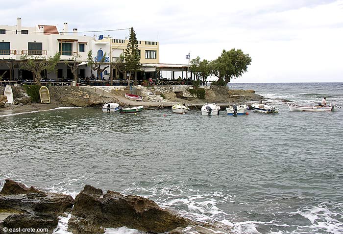 La comida es excelente en casi todas las tabernas: Bogázi tiene una posición inmejorable frente al mar y está dirigida por una pareja griega suiza que produce interesantes “especiales” y algunos buenos platos vegetarianos; Mesostrati ofrece cocina tradicional de Creta a partir de recetas familiares, y también sirve buenos desayunos. Muchos lugares presentan achinosalata, algo así como un gusto adquirido, hecho de las huevas de los erizos de mar que florecen aquí en el agua clara y no contaminada (la mayoría de las personas usa zapatos de plástico o aletas cuando nadan, vendidos en los supermercados locales). En el lado oeste de la aldea, el nombre apropiado de Kafenío Heliobasilema (Sunset Café) es un lugar ideal para una puesta de sol, abierto solo por las noches.